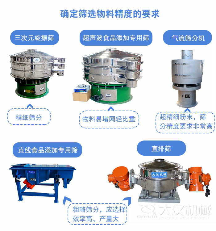了解自己的物料對篩分精度的要求,是精細篩分?還是粗略篩分?如果是精細篩分,通常應在三次元旋振篩、超聲波食品添加專用篩兩種機型中選擇。這兩種機型中,如您的物料具有強吸附性、易團聚、高靜電、高精細、高密度、輕比重等特點,可選用超聲波食品添加專用篩。如果您的物料是碳酸鈣、輕鈣、活性鈣、鋅粉、木粉、中藥粉、碳黑、石墨、活性炭、橡膠助劑、云母粉等超精細粉末,篩分精度要求非常高,應選擇氣流篩分機。如果是粗略篩分,應選擇效率高、產量大的直線食品添加專用篩或直排篩,如無特殊要求,通常選擇直線食品添加專用篩的比較多。