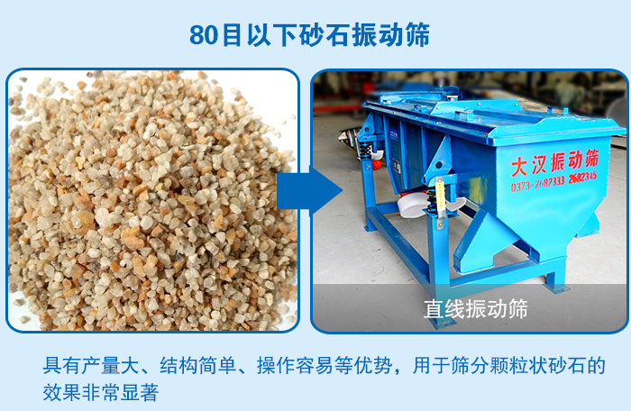 對于80目以下的砂石來說,外形為顆粒狀,建議使用直線振動篩。這種篩機具有產量大、結構簡單、操作容易等優勢,用于篩分顆粒狀砂石的效果非常顯著;