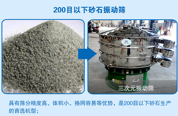 200目以下砂石呈現的就是粉末狀了,篩分過程中就需要考慮到粉塵污染、堵網問題,所以小編建議使用三次元振動篩來對其進行篩分工作。該系列篩機具有篩分精度高、體積小、換網容易等優勢,是200目以下砂石生產的優選機型;