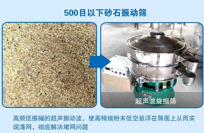 對于500目以下砂石粉末來說已經為高精細粉末物料,如使用普通篩機就會出現堵網問題從而影響篩分精度與產量。對于該類型的砂石產品就需要使用到另一款篩分設備——超聲波旋振篩。該類型篩機的清網裝置使用的是超聲波系統,開啟后篩面會形成一個高頻低振幅的超聲振動波,使高精細粉末低空懸浮在篩面上從而實現清網,解決堵網問題。