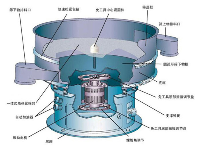 YBS搖擺篩主要由進料口、上蓋、觀察孔、篩框、密封圈、出料口、網架、束環、主樞軸總成、調整塊、彈簧、主軸總成、皮帶輪、底座、檢查孔、電機等部分組成。